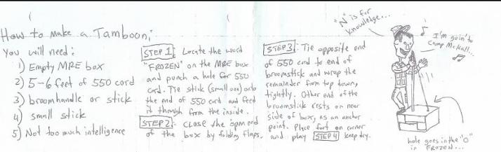 | Want your own band at Camp Mackall? Follow these simple instructions and build your own Tamboni!!! |